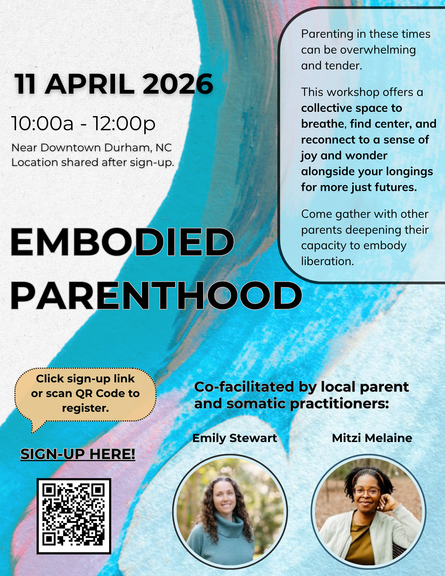 Join us for an initial in-person workshop on Saturday, April 11 from 10am-12pm. If you cannot make the April session, reach out to let us know if you are interested. We are envisioning that there may be an ongoing liberatory embodiment practice group for parents moving forward (including virtual offerings).